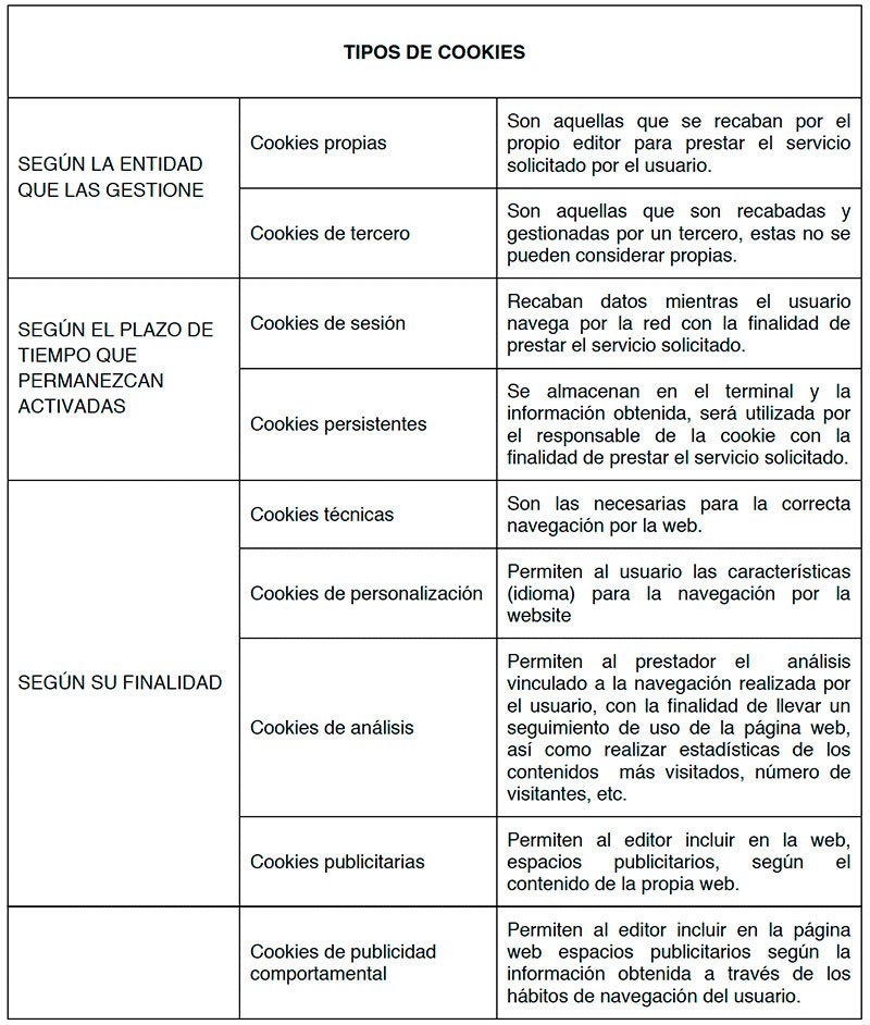 La información que le proporcionamos a continuación, le ayudará a comprender los diferentes tipos de cookies: